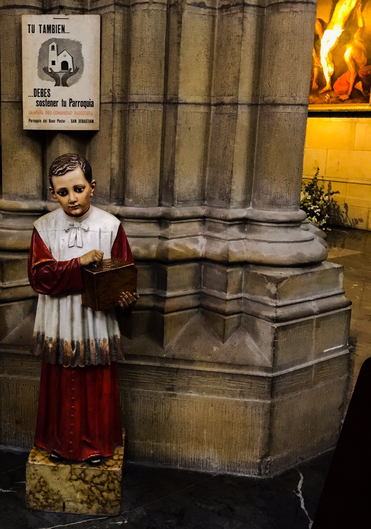 Yeah, this is a life-sized statue of an alterboy that is hollowed out like a piggy-bank so that parishioners can drop coins into both his box and him. Of that’s not weird enough, check out the most passive-agressive sign behind him. Hello, Catholic guilt and weirdness!!