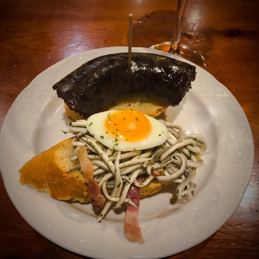 Blood Sausage and Baby Eels with Prosciutto and Egg.