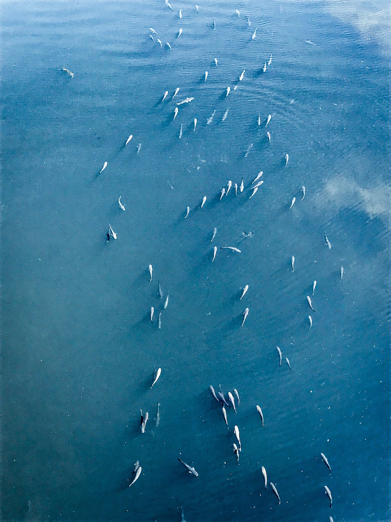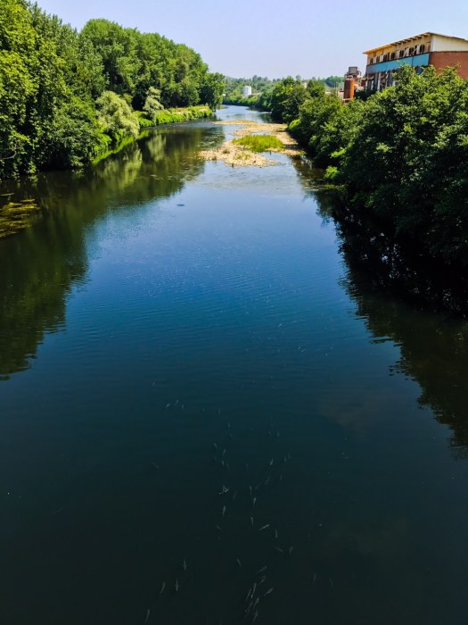 Early on, we crossed a bridge that carried cars and pedestrians over a river. If you can’t make out what’s in the water, just look at the next image;