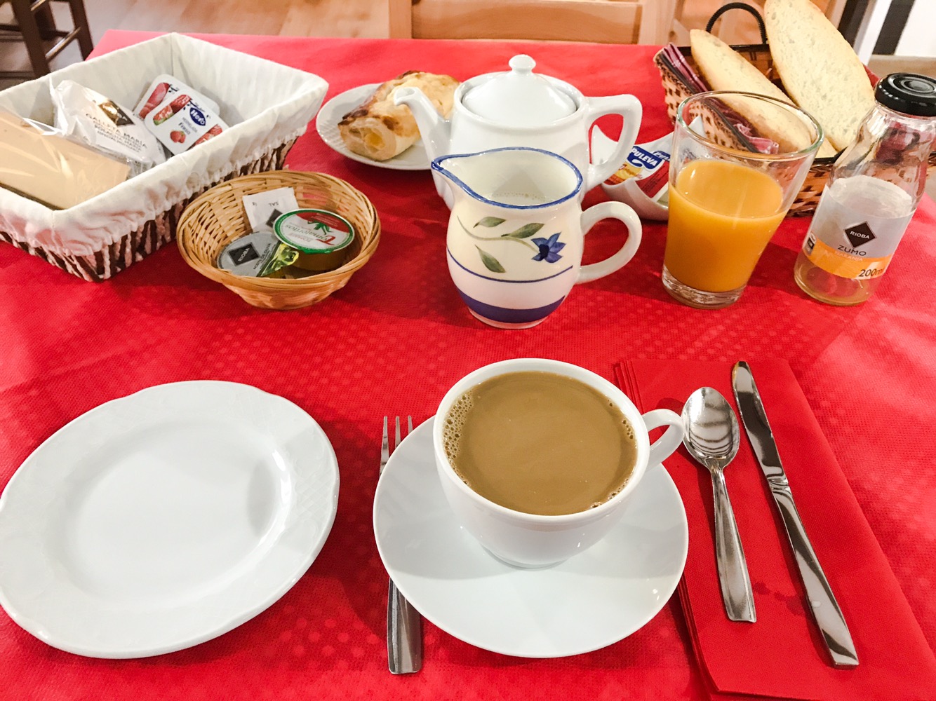 What you’re seeing is a pot of coffee, a pitcher of steamed milk, OJ, toast, and apple fritter, some kind of packaged puff pastry (did not try), butter, English-style biscuits, an assortment of jams, olive oil, and crushed tomatoes. Not the best breakfast ever, but “A” for effort!