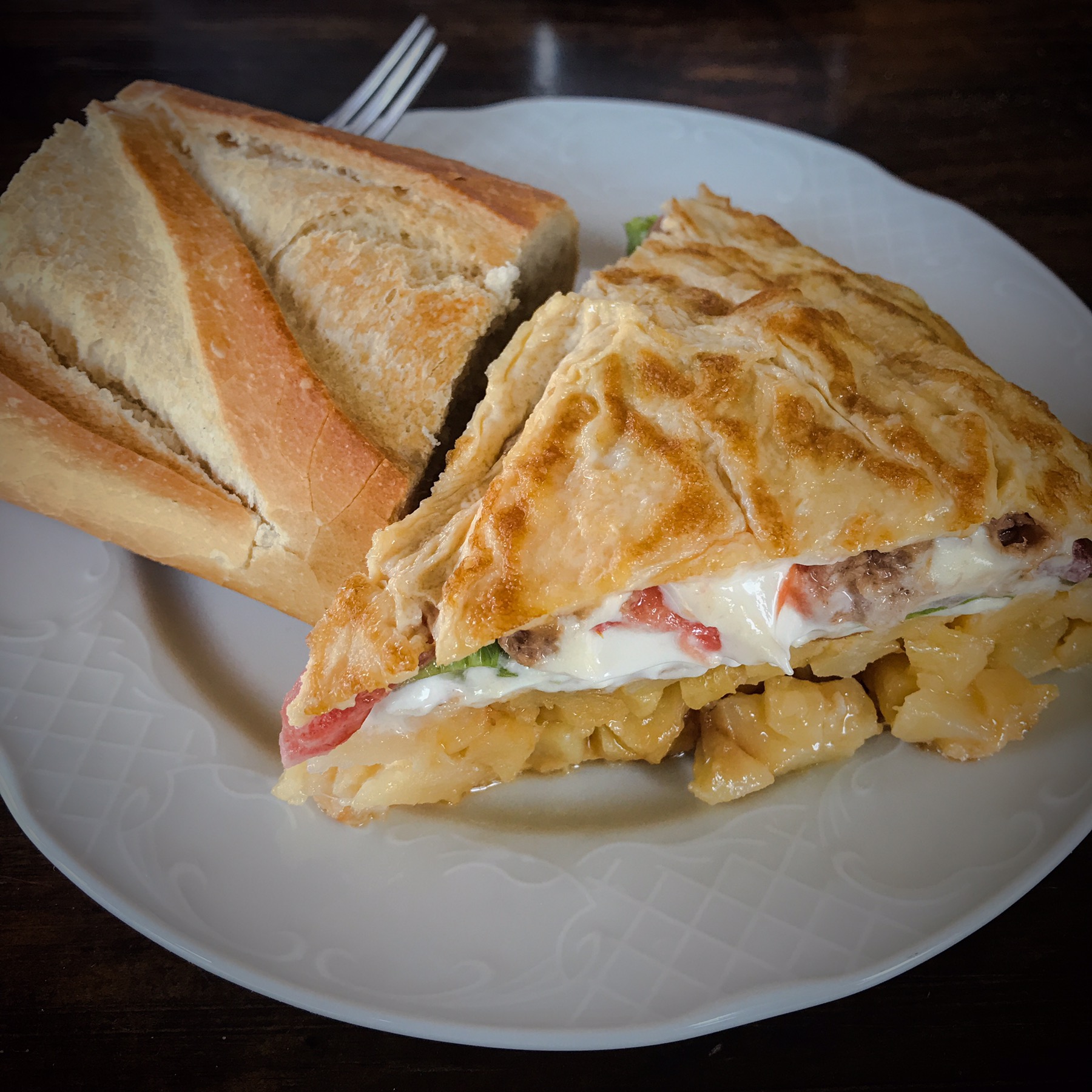 Right on cue, a bar appeared and Mikey got to enjoy a slice of tortilla española. Now, this one was a bit different as it was stuffed with tomato, lettuce, tuna, and mayo. So, it was like a tortilla tuna salad of sorts!