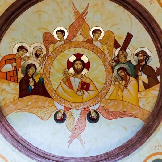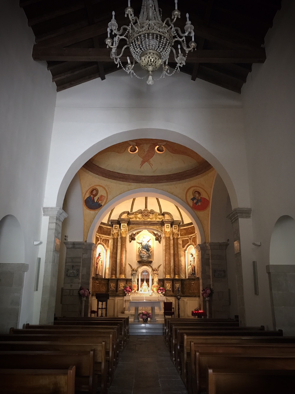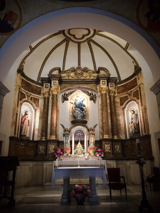 In the sanctuary, you’ll notice the plain white adobe walls. However, note the crystal chandelier which takes pride of place at the center of the church. As Mikey says, “Flashy, not gaudy – but still not Gaudi!” Get it? (Oy, and now we digress!)