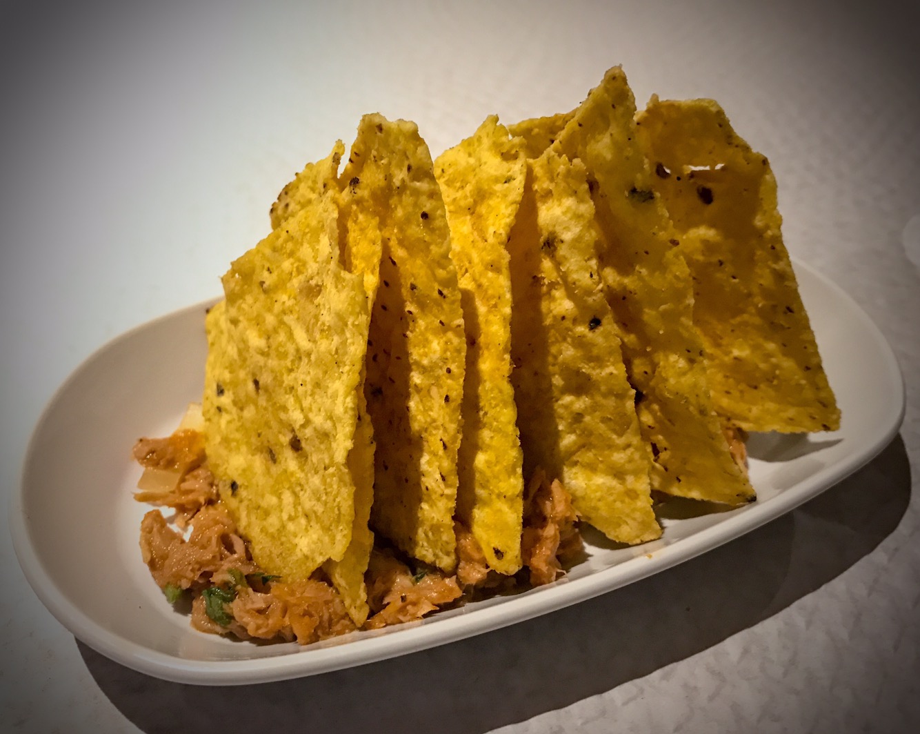 Mikey counted (he’s weird like that) and we had 7 chips stacked up on a bed of flavorless tomato purée. (Shut up- it was free.)