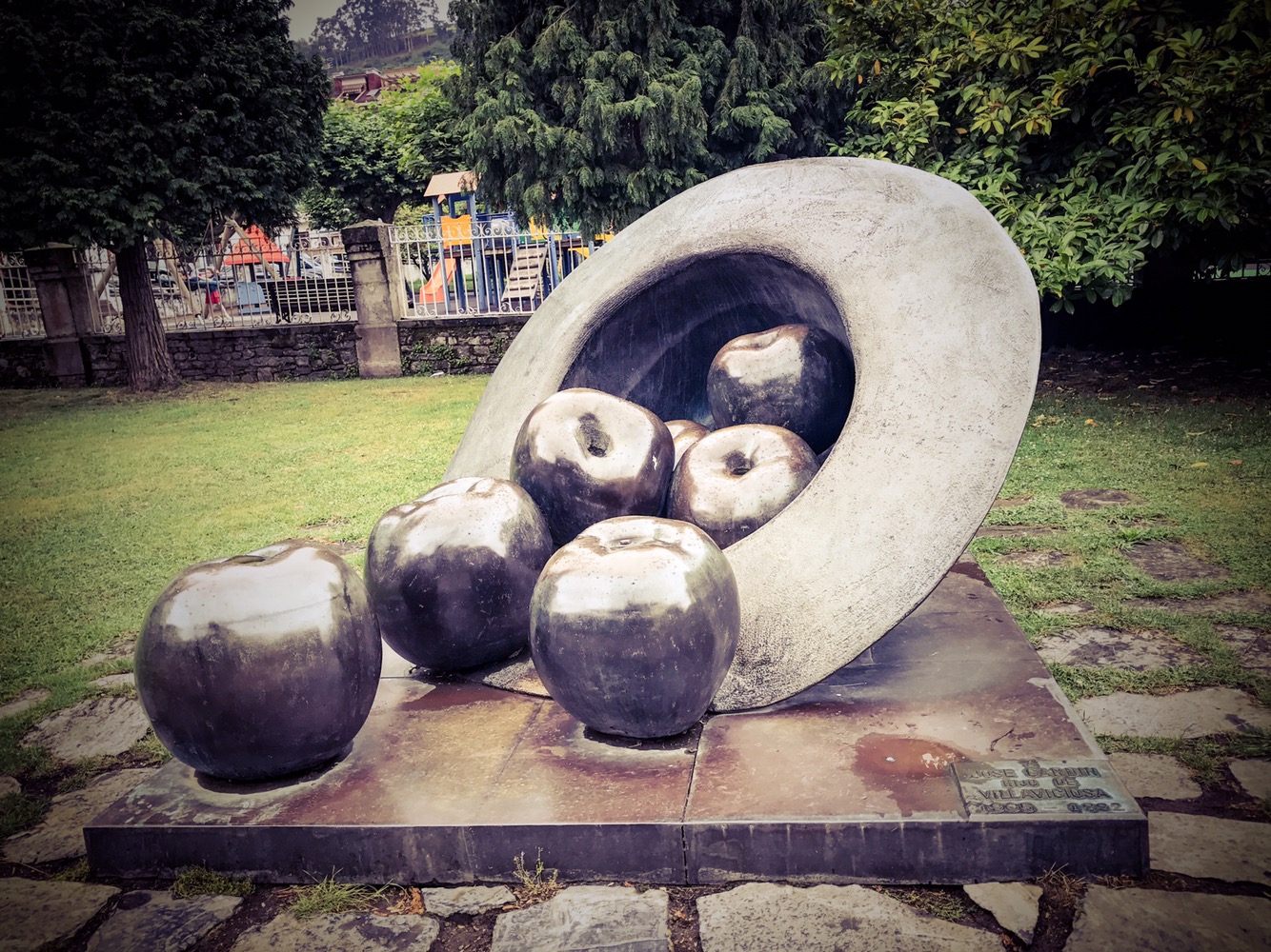 Still, as the town of Villaviciosa is known as the “Apple capital” of Spain, it has to front this crop throughout the year, right? We really liked this hat-like cornucopia of metalic apples spilling onto the lawn.