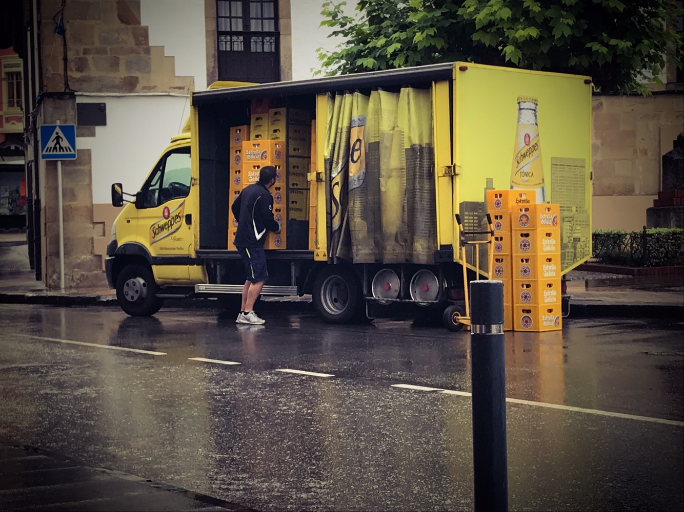 So here’s the senario: three guys get out of a Schweppes’s truck and begin wheeling out cases of empty bottles from the bar. After each make a couple of trips, they start wheeling in cases of full bottles. Now these cases are sodas, tonic waters, beers, liquor bottles – all types. Mind you, this is a small town, there are 3 delivery guys, and it’s raining. Mikey felt a twinge of Taylorism creep up as he witnessed such inefficiency.