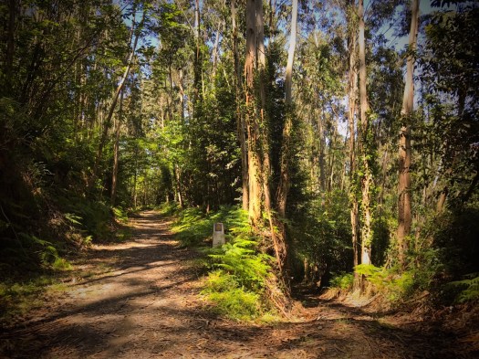 As we returned to the woods for several hours of walking, Mikey noted a most important factor concerning today’s journey: signage. As you’ll note in the above photo, there are two paths diverging in the woods. The left climbs upwards while the right path descends.