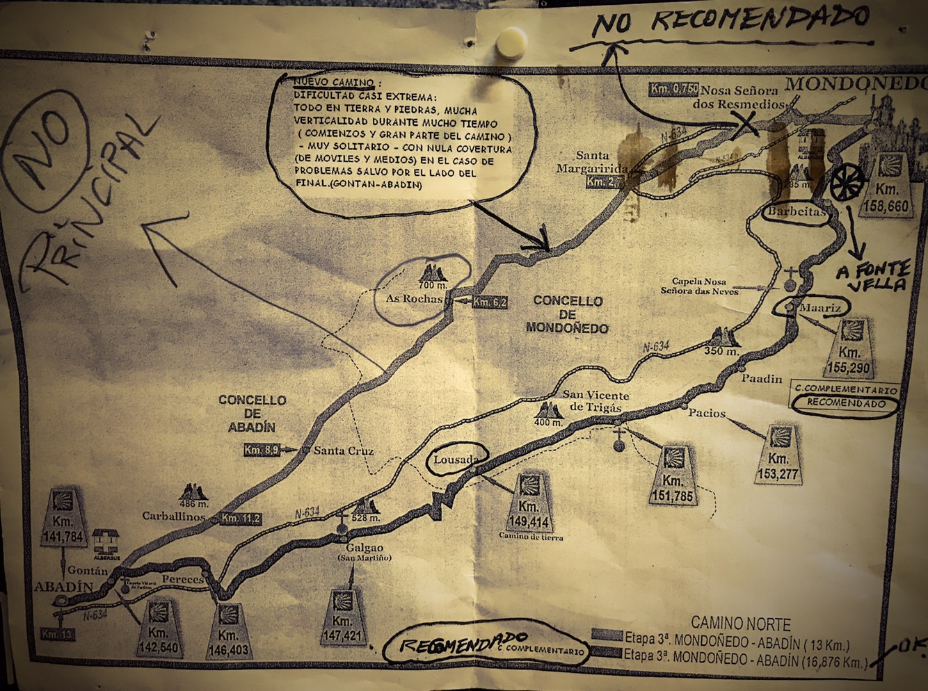More important, however, was the route that departed from it. You see, before she left the albergue last night, the old woman who collected our money warned against taking the “official route.” Instead, she kept shaking her bony finger at a photocopied map, insisting that we take the alternate route.