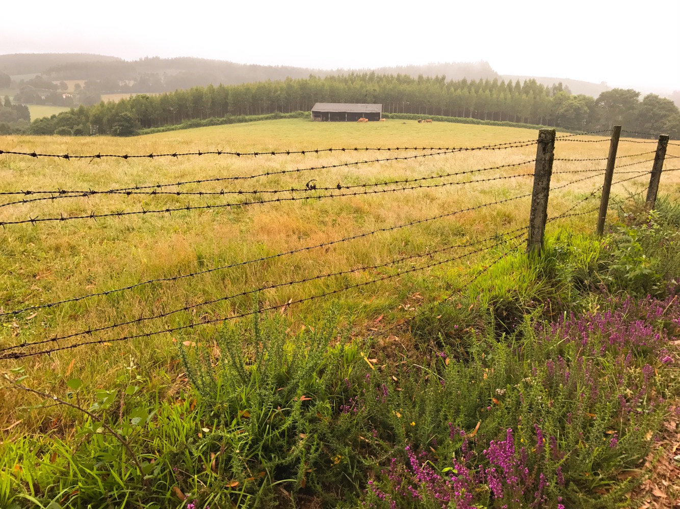 The scenery was equally priceless for quite some time. In the far distance is a cattle barn that was perfectly framed by a rolling hill’s arch. Mikey liked the contrast between the peaceful pastoral scene and the harshness of barbed-wire.