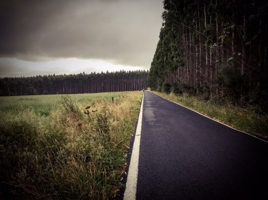 Soon after, the sky grew dark and rain set in for a couple of hours. For the third or fourth time, Mikey donned his “nunzilla” poncho and trudged along an eerily straight road.