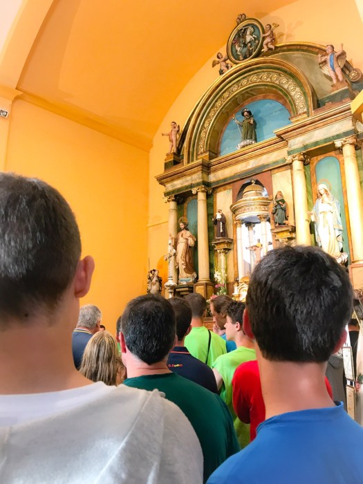 At the end of the service, the local priest called all pilgrims to the altar for a blessing. He was pretty jovial with us, but the holy water part got a bit crazy. I mean, SeaWorld keeps orcas under inhumane states of captivity, but even they mark off the “splash-zone!” G’nite, y’all. 😉