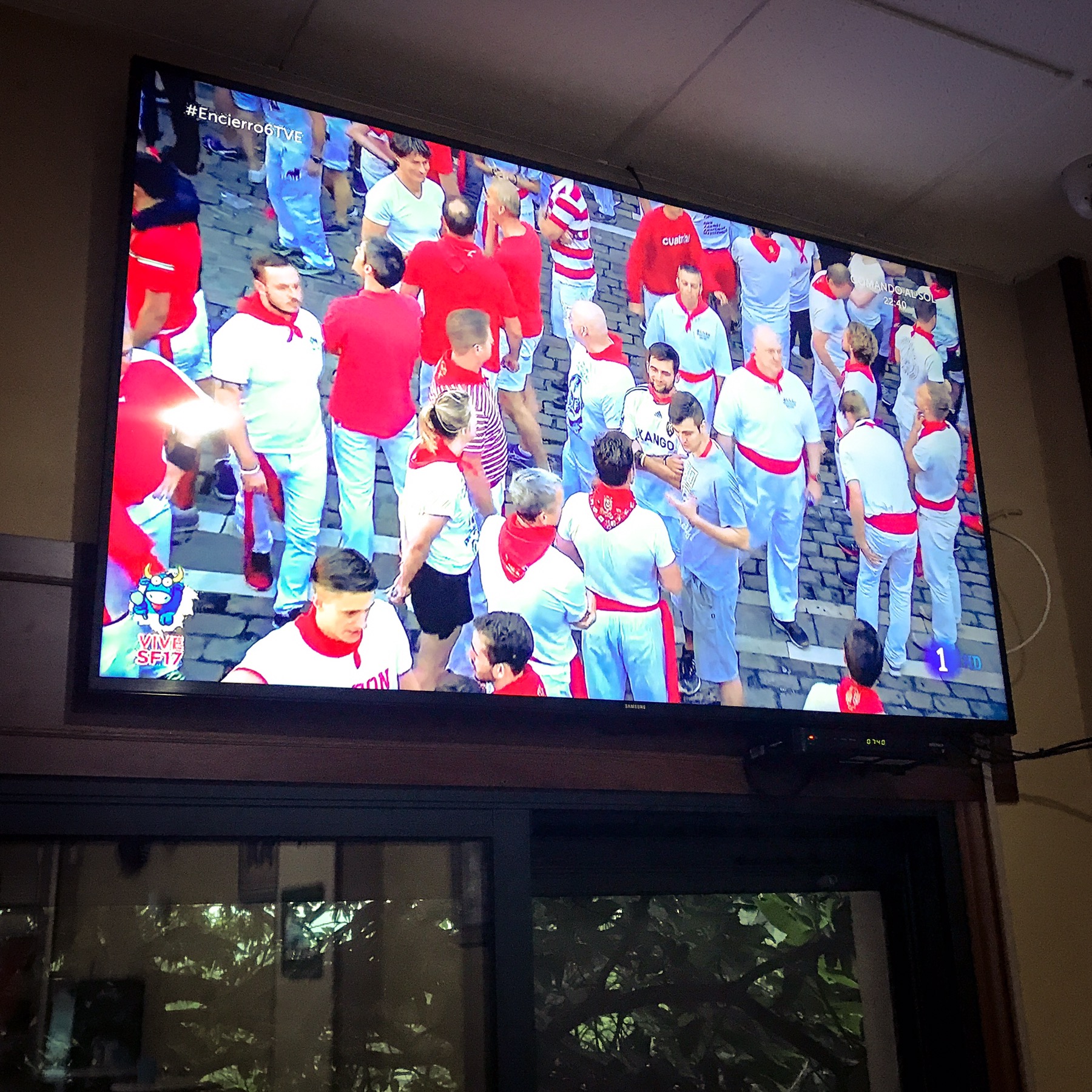 This screen (like most others right now in Spain) is focused non-stop on Pamplona. While Mikey is no longer a fan of bullfighting, at least Pamplona’s Corridas or “Running of the Bulls” gives them a chance to nab a few tourists on their way to the slaughter.
