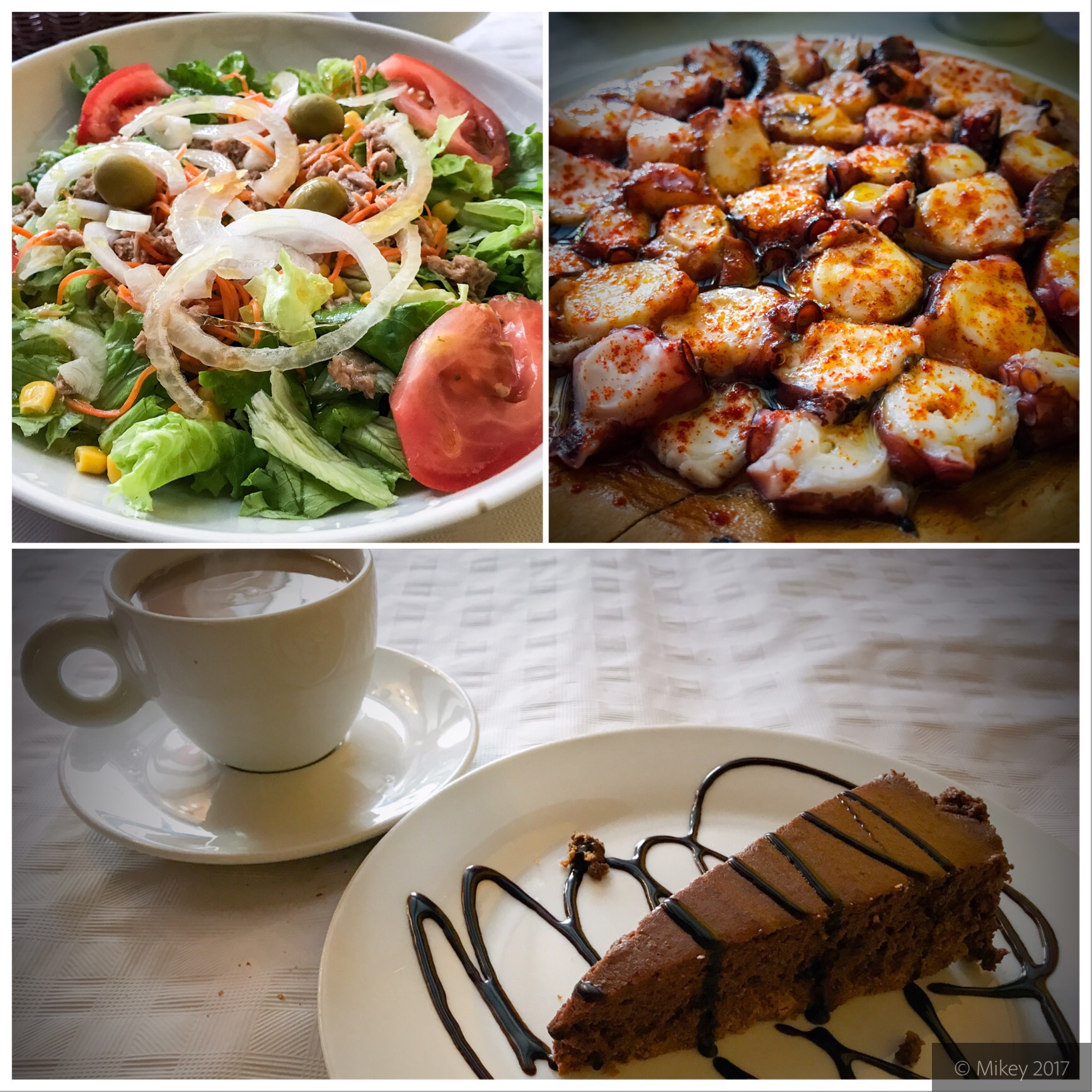 But, Mikey decided to take the plunge and have an entree salad, octopus, chocolate cake, and coffee. With wine and bread it was 12€!