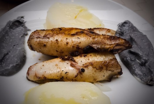 A larger plate spotlighted three grilled squid with potatoes and a garlic and cream sauce made from the squid ink. Sounds a bit off, but Mikey was in love.