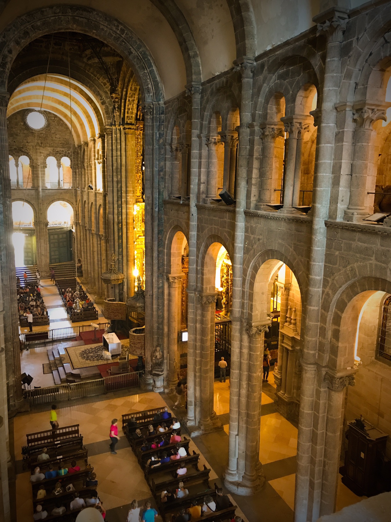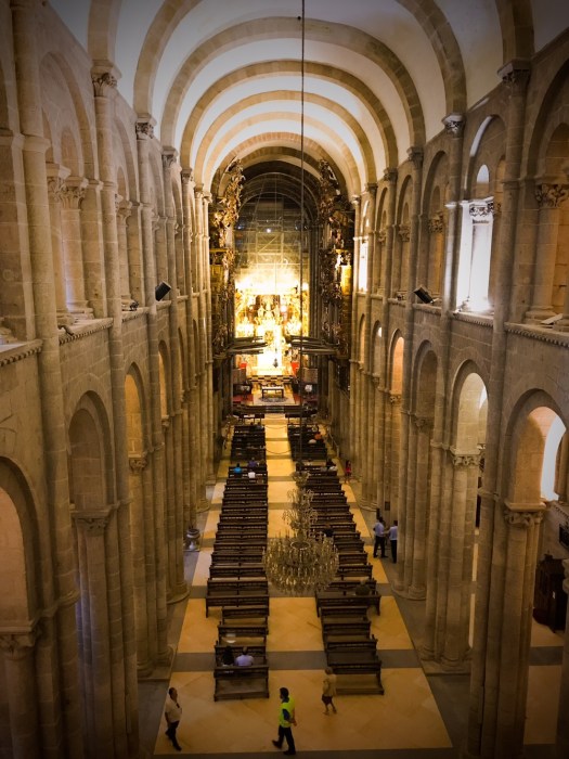 Looking from the transept, one can see the altar from a high vantage point. Although 3 of the 4 outer facades were cosmetically altered to a Baroque style, the actual interior Romanesque was left alone since its physical function required no structural reinforcements. (For reference points, the is taken from above the Door of Pardon.)