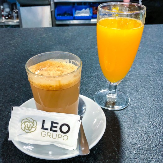 From experience, Mikey finds that a café con leche (basically a long shot of espresso with steamed milk) and fresh orange juice is the best hiking breakfast. It has the right ratio of caffeine, sugar, and fat to get us going, but nothing too heavy that might weigh down our intrepid hiker.