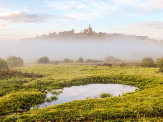 We left the walled city of Galisteo in an early morning fog. While not unusual to experience morning fog in these parts, the river crossing and dramatic views of the city played well with it.