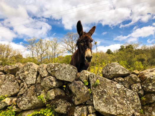 As did this donkey who came up to visit as we were approaching our destination for the day. As with many other “townies,” he came right up to the rock wall and wanted to be petted.