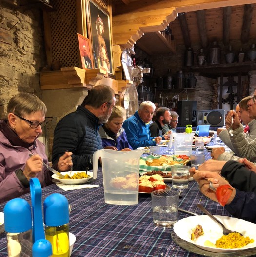 After a hot/cold shower (the water temperature alternating randomly between extremes), we rested briefly and then had our first communal meal at a donativo. These donation-based albergues are sometimes religious and often provide a communal meal for all pilgrims staying the night. Our group numbered close to twenty and the food was fabulous.