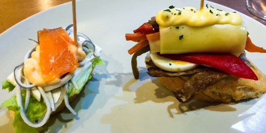 The combinations are also impressive. In this case, there was shrimp, salmon, tomato, and caramelized onion on top of toast.